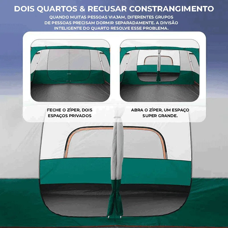 Escolha entre privacidade total, ventilação ampla ou modo totalmente aberto. Flexibilidade ideal para acampamentos em família em qualquer estação do ano.