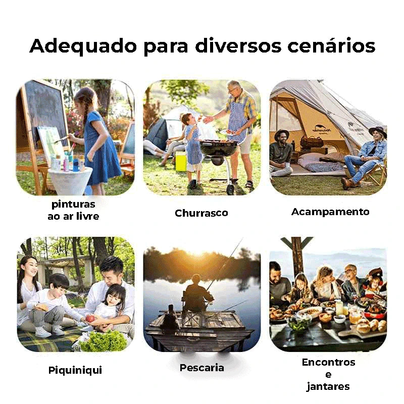 Com design dobrável e portátil, cabe facilmente no porta-malas, mochila ou até mesmo pendurada no ombro.
