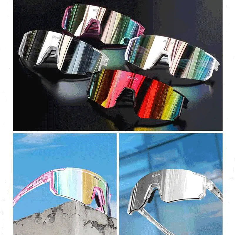 Armação TR90 flexível e ultraleve, com memória elástica que garante ajuste perfeito. Lentes HD resistentes a impactos, com bloqueio UVA/UVB e luz azul. Desempenho durável e confortável, feito para esportes intensos.